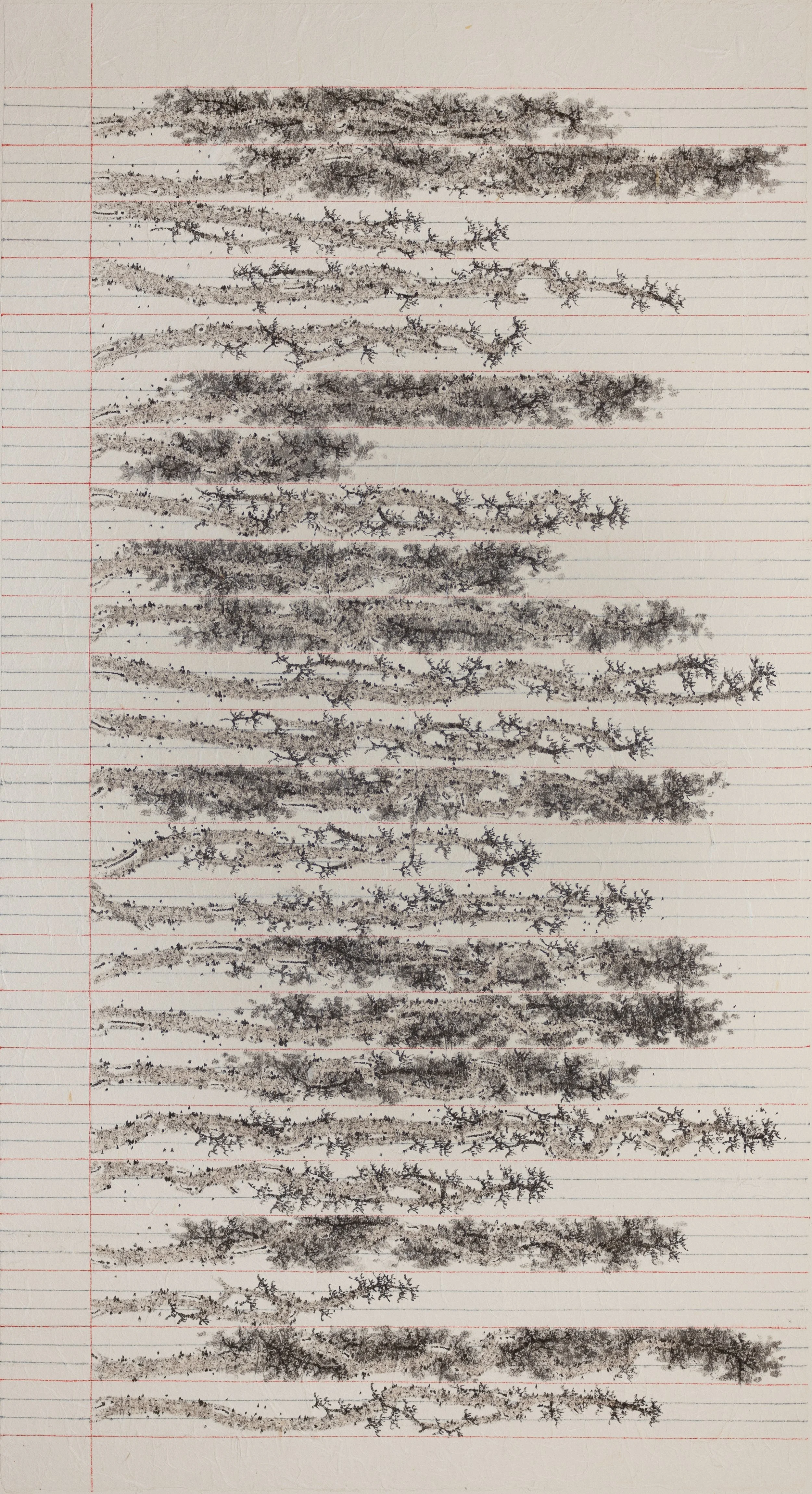 This series of artworks replaces words with ink-drawn rocks, “writing” an “unspeakable story.”