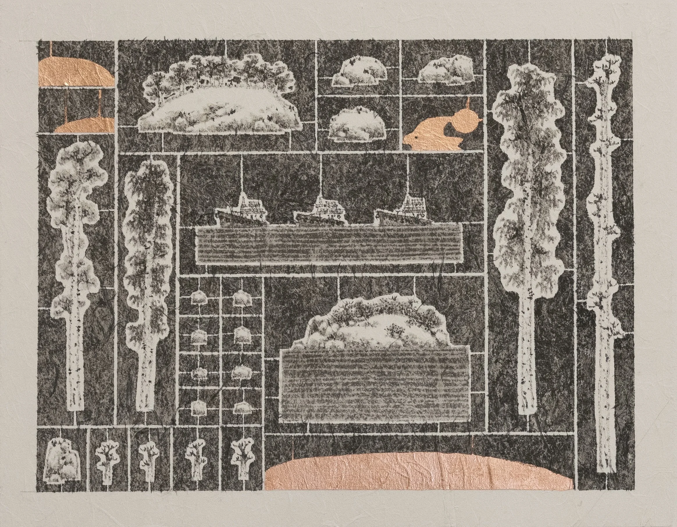 Landscape Model Accessories Series no.9 景觀模型 9 | 2024 | Ink, colour and copper leaf on paper | 38 x 61.5 cm