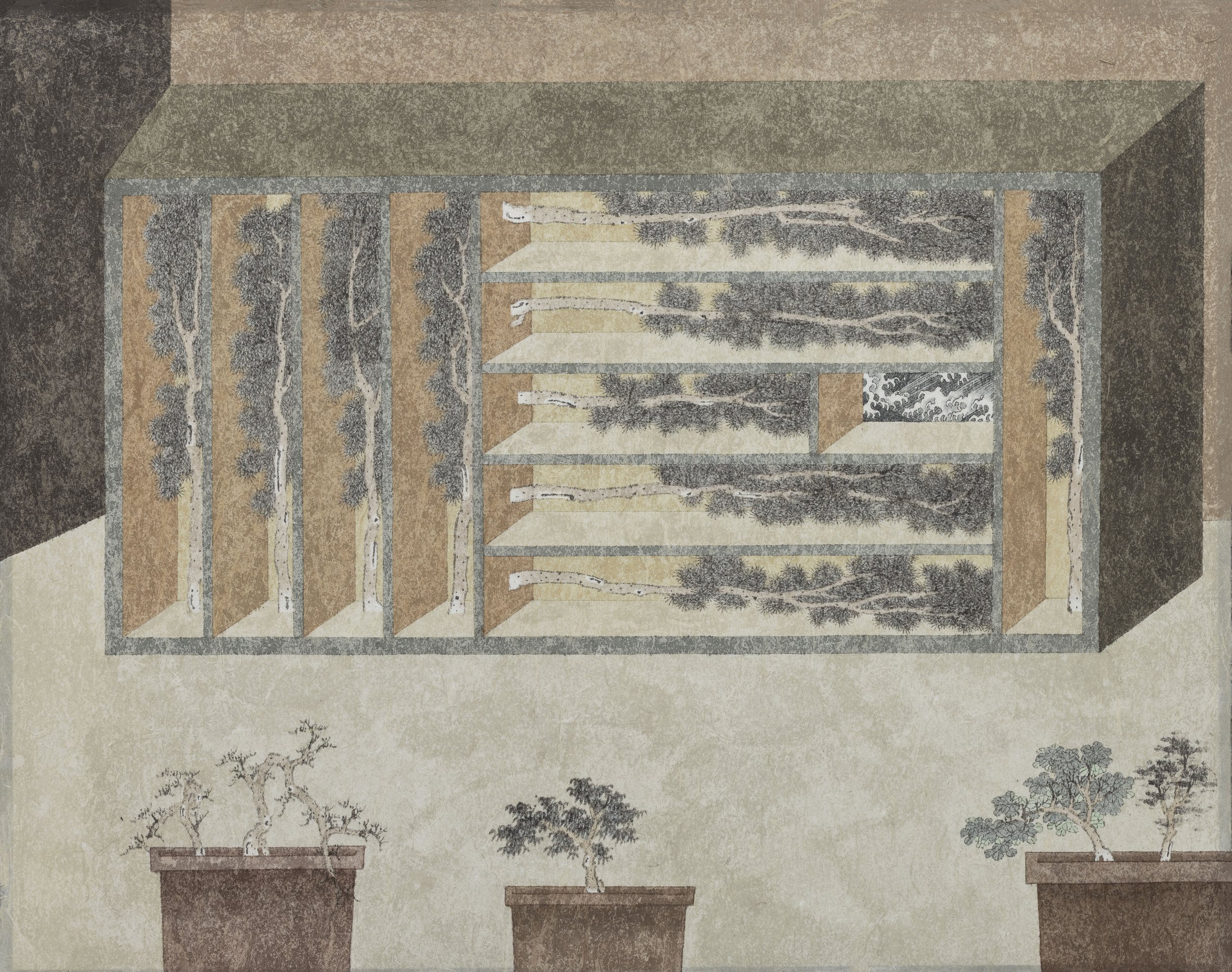 櫃內安放著數棵奮力向上生長的松樹,它們被小心地封存於格層之中,彷彿將那堅毅不屈的人格與生命力,慎重地收藏進最私密的精神領域。這些松樹雖處於被隔離的框架裡,卻依然頑強地伸展枝幹,展現出一種即使被收納、被限制,仍拒絕停止生長的意志。櫃子的其中一格保留了縫隙,使人能依稀窺見外部洶湧澎湃、永無止息的巨浪——這提醒著觀者,危險從未完全消失,只是被暫時隔絕於外。